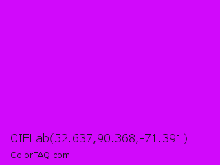 CIELab 52.637,90.368,-71.391 Color is a normal purple color and the nearest color is Vivid Orchid #cc00ff. Hex code #d109fb and RGB value is rgb(209,9,251). In RGB color space, this color is composed of 82% red, 4% green, 98% blue, In CMYK color space, this color is composed of 17% cyan, 96% magenta, 0% yellow , 2% black , In HSL color space, this color has a hue angle of 290° , 97% saturation and 51% lightness.
