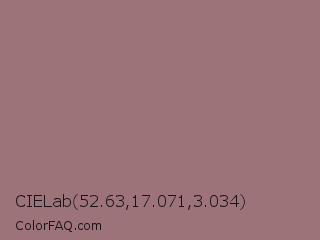 CIELab 52.63,17.071,3.034 Color is a normal red color and the nearest color is Bazaar #98777b. Hex code #9c7379 and RGB value is rgb(156,115,121). In RGB color space, this color is composed of 61% red, 45% green, 47% blue, In CMYK color space, this color is composed of 0% cyan, 26% magenta, 22% yellow , 39% black , In HSL color space, this color has a hue angle of 351° , 17% saturation and 53% lightness.