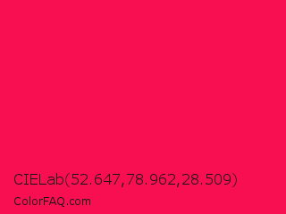 CIELab 52.647,78.962,28.509 Color is a normal rose color and the nearest color is Folly #ff004f. Hex code #f70f52 and RGB value is rgb(247,15,82). In RGB color space, this color is composed of 97% red, 6% green, 32% blue, In CMYK color space, this color is composed of 0% cyan, 94% magenta, 67% yellow , 3% black , In HSL color space, this color has a hue angle of 343° , 94% saturation and 51% lightness.