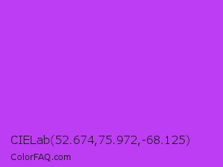 CIELab 52.674,75.972,-68.125 Color is a normal purple color and the nearest color is Veronica #a020f0. Hex code #bd3df5 and RGB value is rgb(189,61,245). In RGB color space, this color is composed of 74% red, 24% green, 96% blue, In CMYK color space, this color is composed of 23% cyan, 75% magenta, 0% yellow , 4% black , In HSL color space, this color has a hue angle of 282° , 90% saturation and 60% lightness.