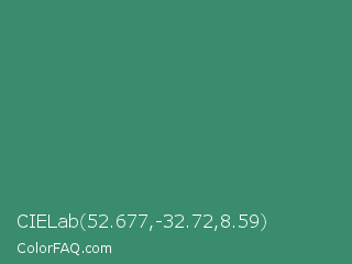 CIELab 52.677,-32.72,8.59 Color is a normal green color and the nearest color is Viridian #40826d. Hex code #398c6e and RGB value is rgb(57,140,110). In RGB color space, this color is composed of 22% red, 55% green, 43% blue, In CMYK color space, this color is composed of 59% cyan, 0% magenta, 21% yellow , 45% black , In HSL color space, this color has a hue angle of 158° , 42% saturation and 39% lightness.