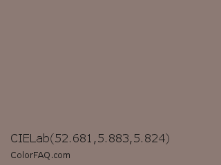 CIELab 52.681,5.883,5.824 Color is a normal color and the nearest color is Hemp #907874. Hex code #8c7a74 and RGB value is rgb(140,122,116). In RGB color space, this color is composed of 55% red, 48% green, 45% blue, In CMYK color space, this color is composed of 0% cyan, 13% magenta, 17% yellow , 45% black , In HSL color space, this color has a hue angle of 15° , 9% saturation and 50% lightness.