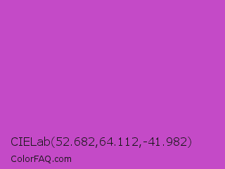CIELab 52.682,64.112,-41.982 Color is a normal magenta color and the nearest color is Fuchsia Pink #c154c1. Hex code #c44ac7 and RGB value is rgb(196,74,199). In RGB color space, this color is composed of 77% red, 29% green, 78% blue, In CMYK color space, this color is composed of 2% cyan, 63% magenta, 0% yellow , 22% black , In HSL color space, this color has a hue angle of 299° , 53% saturation and 54% lightness.