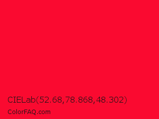 CIELab 52.68,78.868,48.302 Color is a normal red color and the nearest color is Torch Red #fd0e35. Hex code #fa0a30 and RGB value is rgb(250,10,48). In RGB color space, this color is composed of 98% red, 4% green, 19% blue, In CMYK color space, this color is composed of 0% cyan, 96% magenta, 81% yellow , 2% black , In HSL color space, this color has a hue angle of 351° , 96% saturation and 51% lightness.