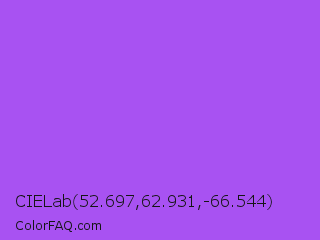 CIELab 52.697,62.931,-66.544 Color is a light purple color and the nearest color is Navy Purple #9457eb. Hex code #a852f2 and RGB value is rgb(168,82,242). In RGB color space, this color is composed of 66% red, 32% green, 95% blue, In CMYK color space, this color is composed of 31% cyan, 66% magenta, 0% yellow , 5% black , In HSL color space, this color has a hue angle of 272° , 86% saturation and 64% lightness.