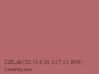 CIELab 52.714,31.117,11.809 Color is a normal red color and the nearest color is Copper Penny #ad6f69. Hex code #b5686b and RGB value is rgb(181,104,107). In RGB color space, this color is composed of 71% red, 41% green, 42% blue, In CMYK color space, this color is composed of 0% cyan, 43% magenta, 41% yellow , 29% black , In HSL color space, this color has a hue angle of 358° , 34% saturation and 56% lightness.