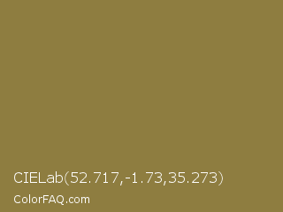 CIELab 52.717,-1.73,35.273 Color is a normal yellow color and the nearest color is Old Moss Green #867e36. Hex code #8e7d40 and RGB value is rgb(142,125,64). In RGB color space, this color is composed of 56% red, 49% green, 25% blue, In CMYK color space, this color is composed of 0% cyan, 12% magenta, 55% yellow , 44% black , In HSL color space, this color has a hue angle of 47° , 38% saturation and 40% lightness.