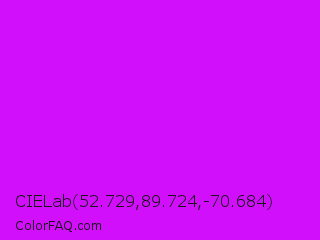 CIELab 52.729,89.724,-70.684 Color is a normal purple color and the nearest color is Vivid Orchid #cc00ff. Hex code #d10ffa and RGB value is rgb(209,15,250). In RGB color space, this color is composed of 82% red, 6% green, 98% blue, In CMYK color space, this color is composed of 16% cyan, 94% magenta, 0% yellow , 2% black , In HSL color space, this color has a hue angle of 290° , 96% saturation and 52% lightness.