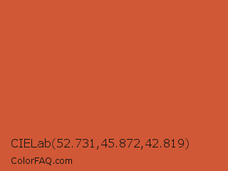 CIELab 52.731,45.872,42.819 Color is a normal red color and the nearest color is Flame Pea #da5b38. Hex code #d15836 and RGB value is rgb(209,88,54). In RGB color space, this color is composed of 82% red, 35% green, 21% blue, In CMYK color space, this color is composed of 0% cyan, 58% magenta, 74% yellow , 18% black , In HSL color space, this color has a hue angle of 13° , 63% saturation and 52% lightness.