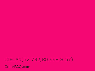 CIELab 52.732,80.998,8.57 Color is a normal rose color and the nearest color is Vivid Raspberry #ff006c. Hex code #f50773 and RGB value is rgb(245,7,115). In RGB color space, this color is composed of 96% red, 3% green, 45% blue, In CMYK color space, this color is composed of 0% cyan, 97% magenta, 53% yellow , 4% black , In HSL color space, this color has a hue angle of 333° , 94% saturation and 49% lightness.