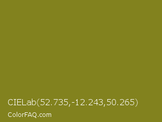 CIELab 52.735,-12.243,50.265 Color is a normal yellow color and the nearest color is Trendy Green #7c881a. Hex code #82821e and RGB value is rgb(130,130,30). In RGB color space, this color is composed of 51% red, 51% green, 12% blue, In CMYK color space, this color is composed of 0% cyan, 0% magenta, 77% yellow , 49% black , In HSL color space, this color has a hue angle of 60° , 63% saturation and 31% lightness.