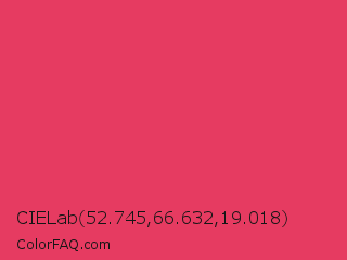 CIELab 52.745,66.632,19.018 Color is a normal red color and the nearest color is Paradise Pink #e63e62. Hex code #e63b61 and RGB value is rgb(230,59,97). In RGB color space, this color is composed of 90% red, 23% green, 38% blue, In CMYK color space, this color is composed of 0% cyan, 74% magenta, 58% yellow , 10% black , In HSL color space, this color has a hue angle of 347° , 77% saturation and 57% lightness.