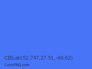CIELab 52.747,27.51,-69.62 Color is a light blue color and the nearest color is Ultramarine Blue #4166f5. Hex code #4875f7 and RGB value is rgb(72,117,247). In RGB color space, this color is composed of 28% red, 46% green, 97% blue, In CMYK color space, this color is composed of 71% cyan, 53% magenta, 0% yellow , 3% black , In HSL color space, this color has a hue angle of 225° , 92% saturation and 63% lightness.