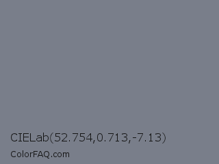 CIELab 52.754,0.713,-7.13 Color is a normal blue color and the nearest color is Topaz #7c778a. Hex code #797e8a and RGB value is rgb(121,126,138). In RGB color space, this color is composed of 47% red, 49% green, 54% blue, In CMYK color space, this color is composed of 12% cyan, 9% magenta, 0% yellow , 46% black , In HSL color space, this color has a hue angle of 222° , 7% saturation and 51% lightness.