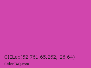 CIELab 52.761,65.262,-26.64 Color is a normal magenta color and the nearest color is Pink Pantone #d74894. Hex code #d145ad and RGB value is rgb(209,69,173). In RGB color space, this color is composed of 82% red, 27% green, 68% blue, In CMYK color space, this color is composed of 0% cyan, 67% magenta, 17% yellow , 18% black , In HSL color space, this color has a hue angle of 315° , 60% saturation and 55% lightness.