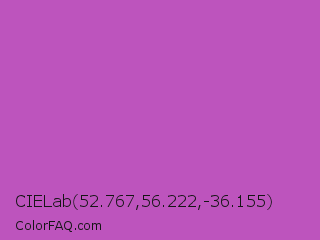 CIELab 52.767,56.222,-36.155 Color is a normal magenta color and the nearest color is Fuchsia Pink #c154c1. Hex code #bd54bd and RGB value is rgb(189,84,189). In RGB color space, this color is composed of 74% red, 33% green, 74% blue, In CMYK color space, this color is composed of 0% cyan, 56% magenta, 0% yellow , 26% black , In HSL color space, this color has a hue angle of 300° , 44% saturation and 54% lightness.