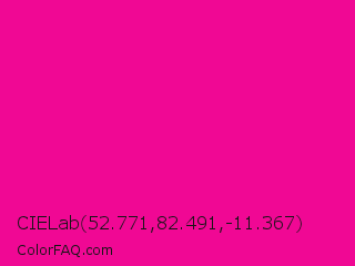 CIELab 52.771,82.491,-11.367 Color is a normal magenta color and the nearest color is Hollywood Cerise #f400a1. Hex code #f00894 and RGB value is rgb(240,8,148). In RGB color space, this color is composed of 94% red, 3% green, 58% blue, In CMYK color space, this color is composed of 0% cyan, 97% magenta, 38% yellow , 6% black , In HSL color space, this color has a hue angle of 324° , 94% saturation and 49% lightness.