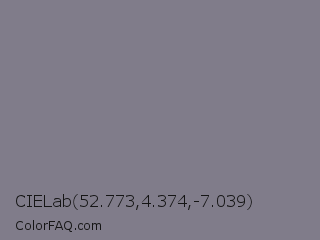 CIELab 52.773,4.374,-7.039 Color is a normal indigo color and the nearest color is Topaz #7c778a. Hex code #807c8a and RGB value is rgb(128,124,138). In RGB color space, this color is composed of 50% red, 49% green, 54% blue, In CMYK color space, this color is composed of 7% cyan, 10% magenta, 0% yellow , 46% black , In HSL color space, this color has a hue angle of 257° , 6% saturation and 51% lightness.