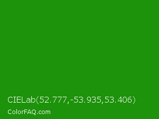 CIELab 52.777,-53.935,53.406 Color is a normal green color and the nearest color is India Green #138808. Hex code #1d920b and RGB value is rgb(29,146,11). In RGB color space, this color is composed of 11% red, 57% green, 4% blue, In CMYK color space, this color is composed of 80% cyan, 0% magenta, 92% yellow , 43% black , In HSL color space, this color has a hue angle of 112° , 86% saturation and 31% lightness.