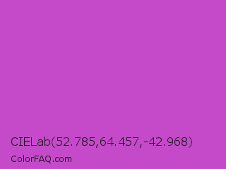 CIELab 52.785,64.457,-42.968 Color is a normal magenta color and the nearest color is Fuchsia Pink #c154c1. Hex code #c44ac9 and RGB value is rgb(196,74,201). In RGB color space, this color is composed of 77% red, 29% green, 79% blue, In CMYK color space, this color is composed of 2% cyan, 63% magenta, 0% yellow , 21% black , In HSL color space, this color has a hue angle of 298° , 54% saturation and 54% lightness.