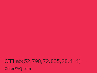 CIELab 52.798,72.835,28.414 Color is a normal red color and the nearest color is Amaranth #e52b50. Hex code #f02b52 and RGB value is rgb(240,43,82). In RGB color space, this color is composed of 94% red, 17% green, 32% blue, In CMYK color space, this color is composed of 0% cyan, 82% magenta, 66% yellow , 6% black , In HSL color space, this color has a hue angle of 348° , 87% saturation and 55% lightness.