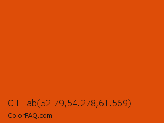 CIELab 52.79,54.278,61.569 Color is a normal orange color and the nearest color is Trinidad #e64e03. Hex code #de4d08 and RGB value is rgb(222,77,8). In RGB color space, this color is composed of 87% red, 30% green, 3% blue, In CMYK color space, this color is composed of 0% cyan, 65% magenta, 96% yellow , 13% black , In HSL color space, this color has a hue angle of 19° , 93% saturation and 45% lightness.