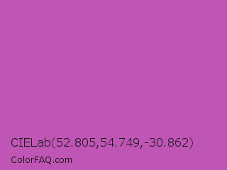 CIELab 52.805,54.749,-30.862 Color is a normal magenta color and the nearest color is Fuchsia Pink #c154c1. Hex code #bf55b4 and RGB value is rgb(191,85,180). In RGB color space, this color is composed of 75% red, 33% green, 71% blue, In CMYK color space, this color is composed of 0% cyan, 55% magenta, 6% yellow , 25% black , In HSL color space, this color has a hue angle of 306° , 45% saturation and 54% lightness.