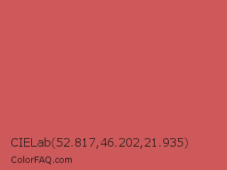 CIELab 52.817,46.202,21.935 Color is a normal red color and the nearest color is Chestnut Rose #cd5c5c. Hex code #cd595b and RGB value is rgb(205,89,91). In RGB color space, this color is composed of 80% red, 35% green, 36% blue, In CMYK color space, this color is composed of 0% cyan, 57% magenta, 56% yellow , 20% black , In HSL color space, this color has a hue angle of 359° , 54% saturation and 58% lightness.