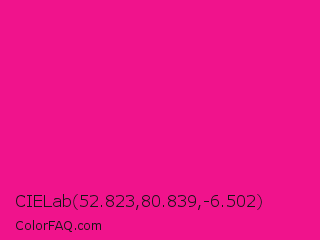 CIELab 52.823,80.839,-6.502 Color is a normal magenta color and the nearest color is Fluorescent Pink #ff1493. Hex code #f0138c and RGB value is rgb(240,19,140). In RGB color space, this color is composed of 94% red, 7% green, 55% blue, In CMYK color space, this color is composed of 0% cyan, 92% magenta, 42% yellow , 6% black , In HSL color space, this color has a hue angle of 327° , 88% saturation and 51% lightness.