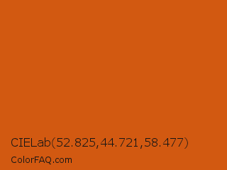 CIELab 52.825,44.721,58.477 Color is a normal orange color and the nearest color is Red Stage #d05f04. Hex code #d25911 and RGB value is rgb(210,89,17). In RGB color space, this color is composed of 82% red, 35% green, 7% blue, In CMYK color space, this color is composed of 0% cyan, 58% magenta, 92% yellow , 18% black , In HSL color space, this color has a hue angle of 22° , 85% saturation and 45% lightness.