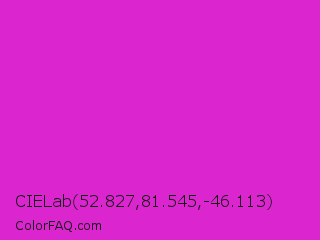 CIELab 52.827,81.545,-46.113 Color is a normal magenta color and the nearest color is Steel Pink #cc33cc. Hex code #db25cf and RGB value is rgb(219,37,207). In RGB color space, this color is composed of 86% red, 15% green, 81% blue, In CMYK color space, this color is composed of 0% cyan, 83% magenta, 5% yellow , 14% black , In HSL color space, this color has a hue angle of 304° , 72% saturation and 50% lightness.