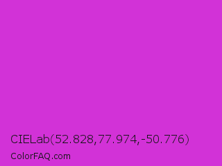 CIELab 52.828,77.974,-50.776 Color is a normal magenta color and the nearest color is Steel Pink #cc33cc. Hex code #d232d7 and RGB value is rgb(210,50,215). In RGB color space, this color is composed of 82% red, 20% green, 84% blue, In CMYK color space, this color is composed of 2% cyan, 77% magenta, 0% yellow , 16% black , In HSL color space, this color has a hue angle of 298° , 67% saturation and 52% lightness.