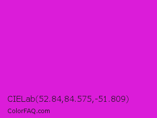CIELab 52.84,84.575,-51.809 Color is a normal magenta color and the nearest color is Steel Pink #cc33cc. Hex code #db1cd9 and RGB value is rgb(219,28,217). In RGB color space, this color is composed of 86% red, 11% green, 85% blue, In CMYK color space, this color is composed of 0% cyan, 87% magenta, 1% yellow , 14% black , In HSL color space, this color has a hue angle of 301° , 77% saturation and 48% lightness.