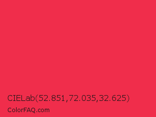 CIELab 52.851,72.035,32.625 Color is a normal red color and the nearest color is Amaranth #e52b50. Hex code #f02d4b and RGB value is rgb(240,45,75). In RGB color space, this color is composed of 94% red, 18% green, 29% blue, In CMYK color space, this color is composed of 0% cyan, 81% magenta, 69% yellow , 6% black , In HSL color space, this color has a hue angle of 351° , 87% saturation and 56% lightness.