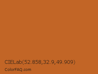 CIELab 52.858,32.9,49.909 Color is a normal orange color and the nearest color is Ruddy Brown #bb6528. Hex code #c26526 and RGB value is rgb(194,101,38). In RGB color space, this color is composed of 76% red, 40% green, 15% blue, In CMYK color space, this color is composed of 0% cyan, 48% magenta, 80% yellow , 24% black , In HSL color space, this color has a hue angle of 24° , 67% saturation and 45% lightness.