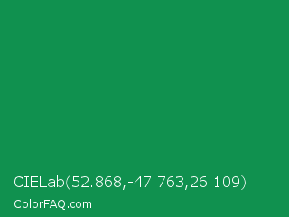 CIELab 52.868,-47.763,26.109 Color is a normal green color and the nearest color is Spanish Green #009150. Hex code #10914f and RGB value is rgb(16,145,79). In RGB color space, this color is composed of 6% red, 57% green, 31% blue, In CMYK color space, this color is composed of 89% cyan, 0% magenta, 46% yellow , 43% black , In HSL color space, this color has a hue angle of 149° , 80% saturation and 32% lightness.