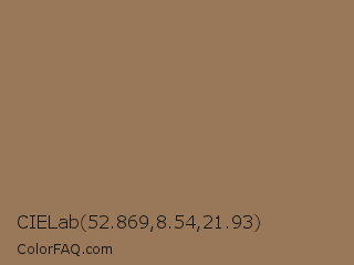 CIELab 52.869,8.54,21.93 Color is a normal orange color and the nearest color is Liver Chestnut #987456. Hex code #997859 and RGB value is rgb(153,120,89). In RGB color space, this color is composed of 60% red, 47% green, 35% blue, In CMYK color space, this color is composed of 0% cyan, 22% magenta, 42% yellow , 40% black , In HSL color space, this color has a hue angle of 29° , 26% saturation and 47% lightness.