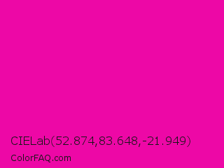 CIELab 52.874,83.648,-21.949 Color is a normal magenta color and the nearest color is Hollywood Cerise #f400a1. Hex code #ed08a6 and RGB value is rgb(237,8,166). In RGB color space, this color is composed of 93% red, 3% green, 65% blue, In CMYK color space, this color is composed of 0% cyan, 97% magenta, 30% yellow , 7% black , In HSL color space, this color has a hue angle of 319° , 93% saturation and 48% lightness.