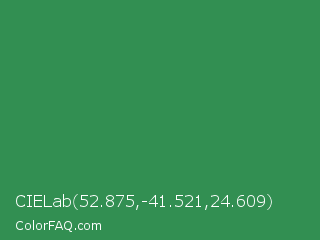 CIELab 52.875,-41.521,24.609 Color is a normal green color and the nearest color is Sea Green #2e8b57. Hex code #328f52 and RGB value is rgb(50,143,82). In RGB color space, this color is composed of 20% red, 56% green, 32% blue, In CMYK color space, this color is composed of 65% cyan, 0% magenta, 43% yellow , 44% black , In HSL color space, this color has a hue angle of 141° , 48% saturation and 38% lightness.