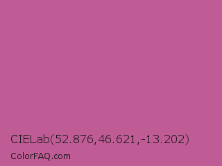 CIELab 52.876,46.621,-13.202 Color is a normal magenta color and the nearest color is Pearly Purple #b768a2. Hex code #bf5c96 and RGB value is rgb(191,92,150). In RGB color space, this color is composed of 75% red, 36% green, 59% blue, In CMYK color space, this color is composed of 0% cyan, 52% magenta, 21% yellow , 25% black , In HSL color space, this color has a hue angle of 325° , 44% saturation and 55% lightness.