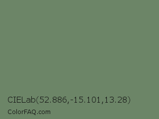 CIELab 52.886,-15.101,13.28 Color is a normal green color and the nearest color is Highland #6f8e63. Hex code #6c8567 and RGB value is rgb(108,133,103). In RGB color space, this color is composed of 42% red, 52% green, 40% blue, In CMYK color space, this color is composed of 19% cyan, 0% magenta, 23% yellow , 48% black , In HSL color space, this color has a hue angle of 110° , 13% saturation and 46% lightness.