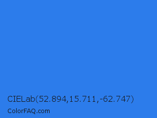 CIELab 52.894,15.711,-62.747 Color is a normal blue color and the nearest color is Bleu De France #318ce7. Hex code #2c7ceb and RGB value is rgb(44,124,235). In RGB color space, this color is composed of 17% red, 49% green, 92% blue, In CMYK color space, this color is composed of 81% cyan, 47% magenta, 0% yellow , 8% black , In HSL color space, this color has a hue angle of 215° , 83% saturation and 55% lightness.