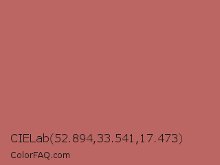 CIELab 52.894,33.541,17.473 Color is a normal red color and the nearest color is Fuzzy Wuzzy #cc6666. Hex code #bb6662 and RGB value is rgb(187,102,98). In RGB color space, this color is composed of 73% red, 40% green, 38% blue, In CMYK color space, this color is composed of 0% cyan, 45% magenta, 48% yellow , 27% black , In HSL color space, this color has a hue angle of 3° , 40% saturation and 56% lightness.