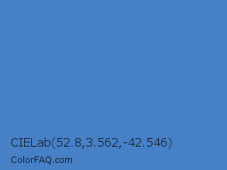 CIELab 52.8,3.562,-42.546 Color is a normal blue color and the nearest color is Cyan Blue Azure #4682bf. Hex code #4680c7 and RGB value is rgb(70,128,199). In RGB color space, this color is composed of 27% red, 50% green, 78% blue, In CMYK color space, this color is composed of 65% cyan, 36% magenta, 0% yellow , 22% black , In HSL color space, this color has a hue angle of 213° , 54% saturation and 53% lightness.
