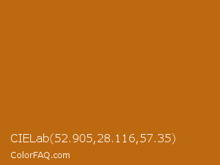 CIELab 52.905,28.116,57.35 Color is a normal orange color and the nearest color is Alloy Orange #c46210. Hex code #bd6910 and RGB value is rgb(189,105,16). In RGB color space, this color is composed of 74% red, 41% green, 6% blue, In CMYK color space, this color is composed of 0% cyan, 44% magenta, 92% yellow , 26% black , In HSL color space, this color has a hue angle of 31° , 84% saturation and 40% lightness.