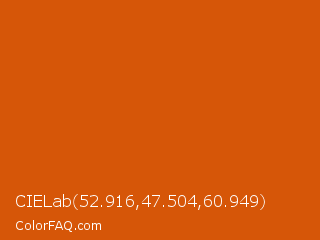 CIELab 52.916,47.504,60.949 Color is a normal orange color and the nearest color is Red Stage #d05f04. Hex code #d65608 and RGB value is rgb(214,86,8). In RGB color space, this color is composed of 84% red, 34% green, 3% blue, In CMYK color space, this color is composed of 0% cyan, 60% magenta, 96% yellow , 16% black , In HSL color space, this color has a hue angle of 23° , 93% saturation and 44% lightness.