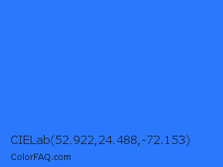 CIELab 52.922,24.488,-72.153 Color is a normal blue color and the nearest color is Blue Crayola #1f75fe. Hex code #2b78fc and RGB value is rgb(43,120,252). In RGB color space, this color is composed of 17% red, 47% green, 99% blue, In CMYK color space, this color is composed of 83% cyan, 52% magenta, 0% yellow , 1% black , In HSL color space, this color has a hue angle of 218° , 97% saturation and 58% lightness.