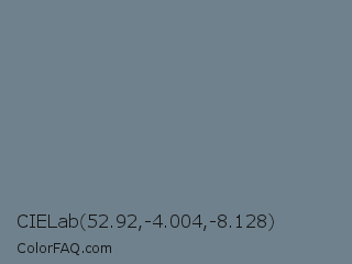 CIELab 52.92,-4.004,-8.128 Color is a normal blue color and the nearest color is Slate Gray #708090. Hex code #6f818c and RGB value is rgb(111,129,140). In RGB color space, this color is composed of 44% red, 51% green, 55% blue, In CMYK color space, this color is composed of 21% cyan, 8% magenta, 0% yellow , 45% black , In HSL color space, this color has a hue angle of 203° , 12% saturation and 49% lightness.
