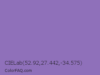 CIELab 52.92,27.442,-34.575 Color is a normal violet color and the nearest color is Middle Blue Purple #8b72be. Hex code #8f70ba and RGB value is rgb(143,112,186). In RGB color space, this color is composed of 56% red, 44% green, 73% blue, In CMYK color space, this color is composed of 23% cyan, 40% magenta, 0% yellow , 27% black , In HSL color space, this color has a hue angle of 265° , 35% saturation and 58% lightness.