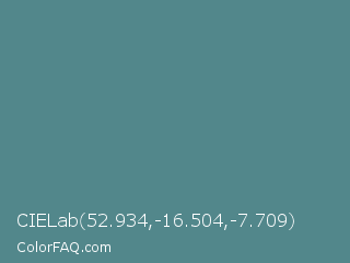 CIELab 52.934,-16.504,-7.709 Color is a normal cyan color and the nearest color is Smalt Blue #51808f. Hex code #52878b and RGB value is rgb(82,135,139). In RGB color space, this color is composed of 32% red, 53% green, 55% blue, In CMYK color space, this color is composed of 41% cyan, 3% magenta, 0% yellow , 45% black , In HSL color space, this color has a hue angle of 184° , 26% saturation and 43% lightness.